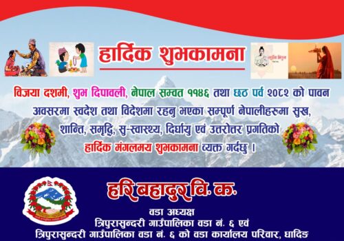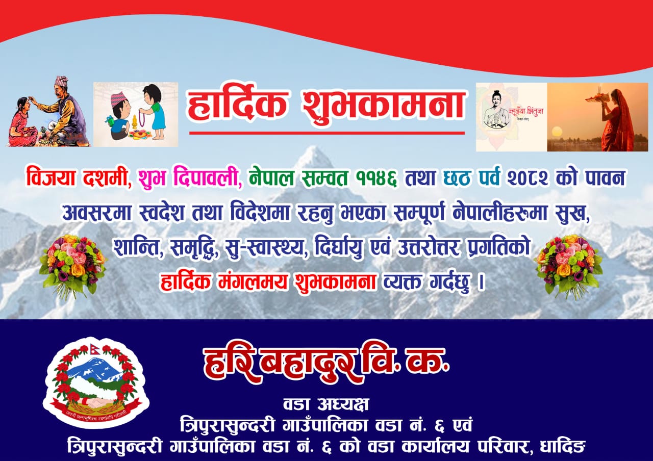 धादिङ । मंसिर ४,२०८२ धादिङको ऐतिहासिक तथा धार्मिक महत्व बोकेको त्रिपुरासुन्दरी माई मन्दिर परिसरमा आगामी मंसिर ७ गते लाग्ने त्रिपुरासुन्दरी माई (न्वागी) मेलाको अवसरमा स्थानीय सरकारले सार्वजनिक विदा दिने भएको छ। त्रिपुरासुन्दरी गाउँकार्यपालिकाकाे मंसिर ३ गते... विस्तृतमा