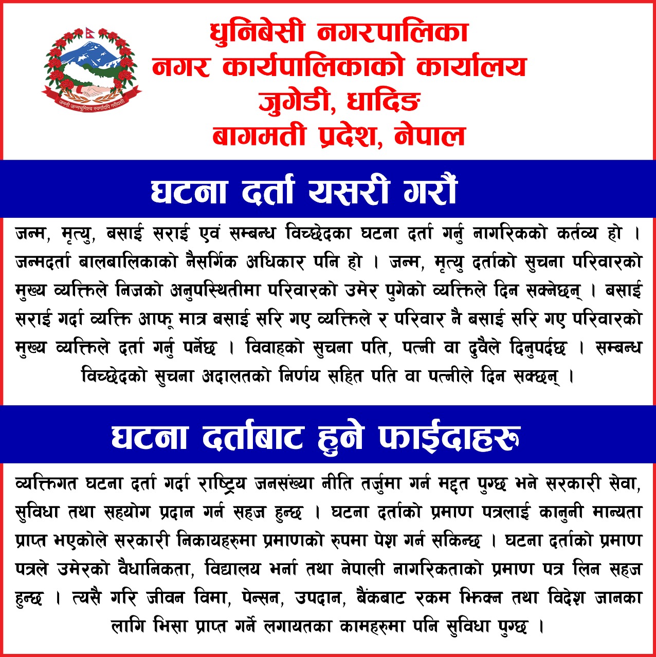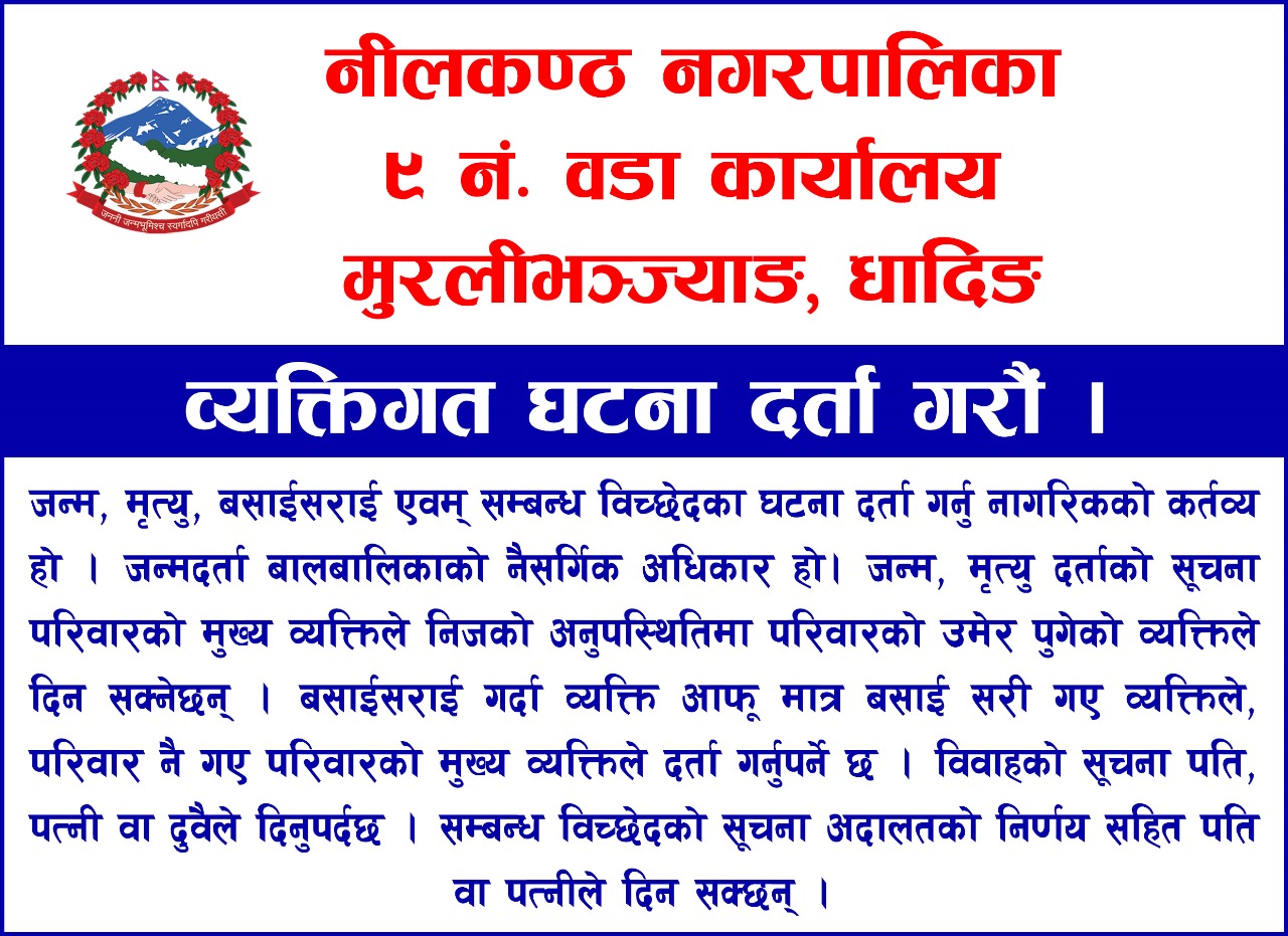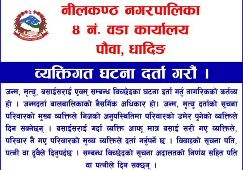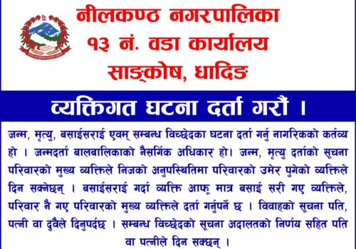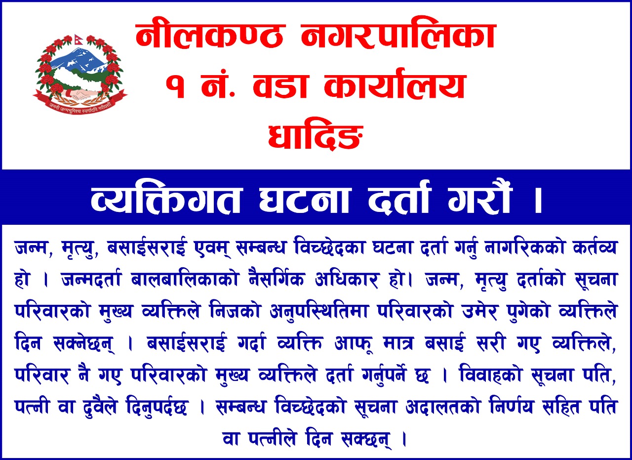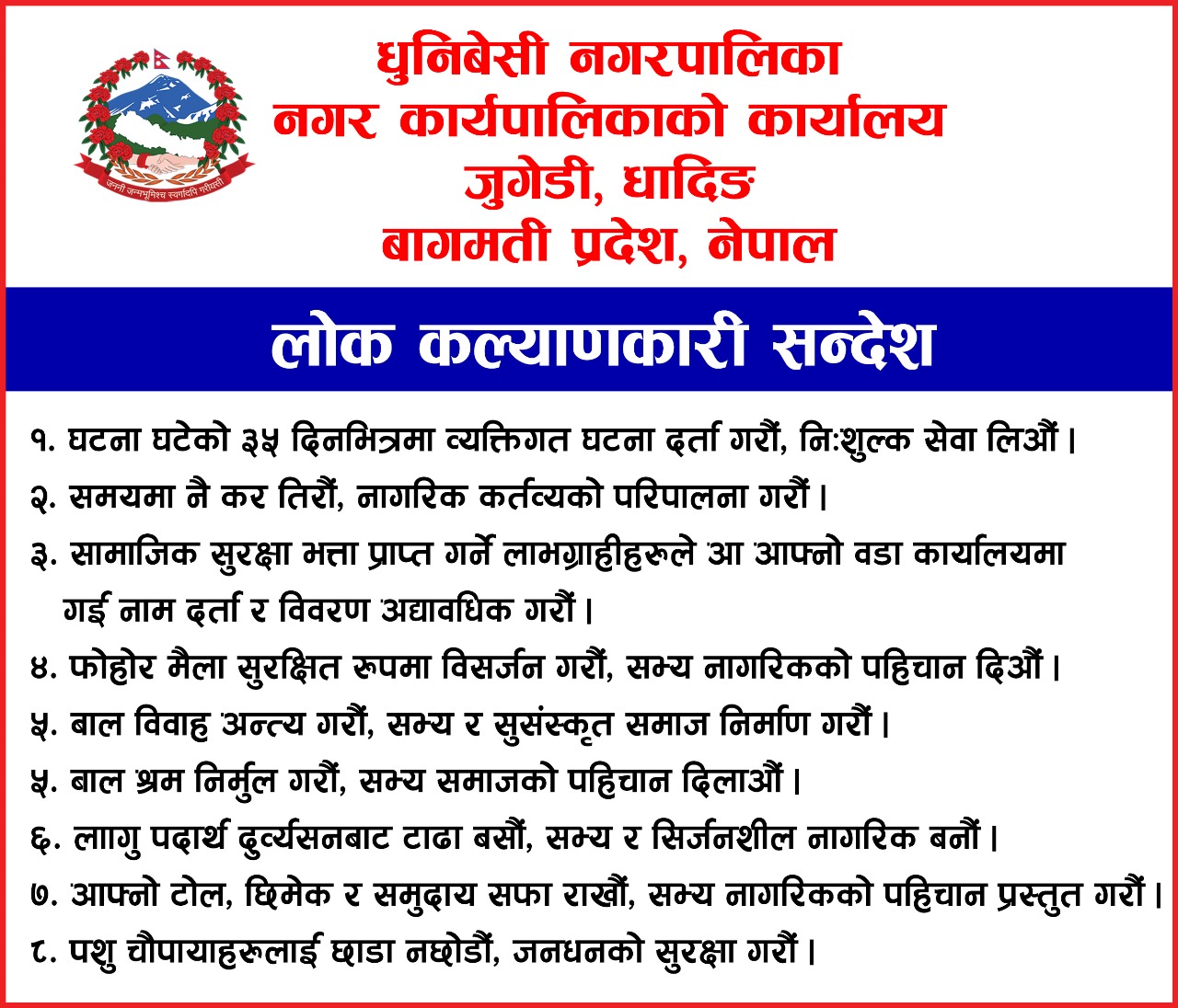 धादिङ । मंसिर ११,२०८२ राष्ट्रिय सतर्कता केन्द्रद्वारा वर्तमान अवस्थामा स्थानीय तहका प्रमुख, तथा उपप्रमुख,... विस्तृतमा